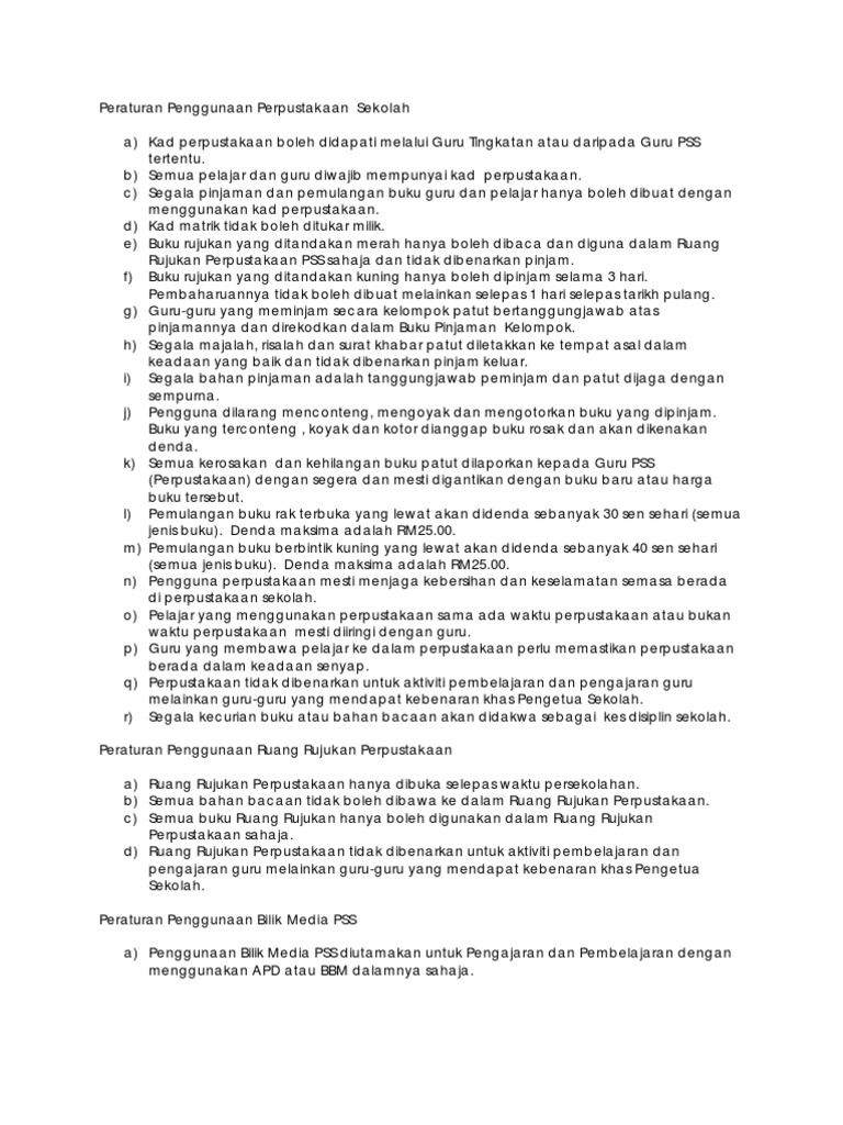 Semua pelajar yang masuk ke pusat sumber mestilah berpakaian seragam sekolah dengan kemas. Peraturan pusat sumber sekolah peraturan am peraturan khusus peraturan penggunaan alat ruang peraturan pinjaman dan pemulangan bahan alat 1. Guru hendaklah menandatangani buku rekod penggunaan perpustakaan setiap kali membawa pelajar masuk ke perpustakaan. Buku rujukan tidak dibenarkan dibawa masuk.