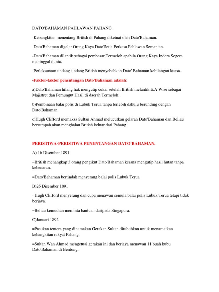 Peristiwa penentangan dato bahaman pdf. Sejarah dato bahaman pahlawan pahang pages 101 142 flip. Semangat ini takkan pernah hilang dan luntur. Ii mereka menduduki kawasan pengaruh mat salleh dengan melaksanakan sistem cukai kepala dan surat perahu. Peristiwa penentangan dato maharaja lela bersama sama orang kaya kaya seri agar diraja ngah kamdin dato sagor dan pembesar pembesar negeri lain telah bermesyuarat di durian sebatang pada 21 julai 1875 untuk merancang perjuangan dan pembunuhan j w w.