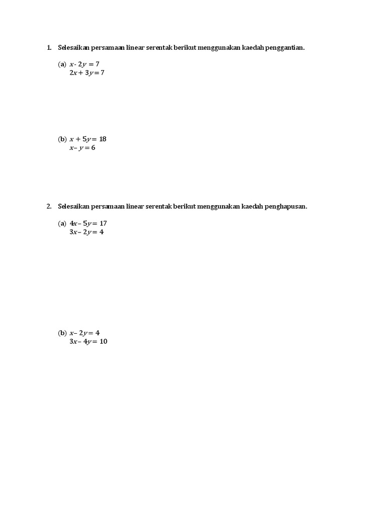B1001 basic algebra simultaneous linear equation 1 persamaan serentak linear objektif am. Persamaan serentak simultaneous equation dalam dua pemboleh ubah yang terdiri satu persamaan linear dan satu persamaan tak linear boleh diselesaikan melalui kaedah penggantian substitution method. Kali ini kita lihat formula persamaan linear serentak.