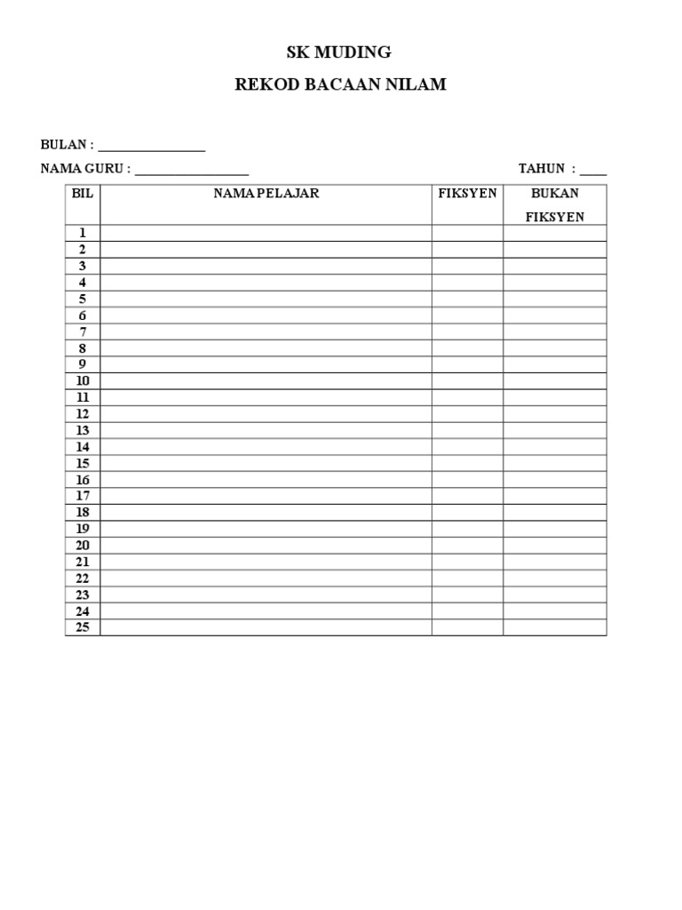 Bacaan dikira ikut bacaan terkumpul. Borang rekod bacaan nilam. Contoh rekod bacaan 2020 klik pada link punca kuasa nilam 2020 klik pada link cara perekodan nilam 2020 klik pada link cara perekodan nilam pajsk ikut jumlah bahan buku dan bukan buku. Rekod bacaan murid versi baru kemaskini per kelas rakan pembaca murid telah.