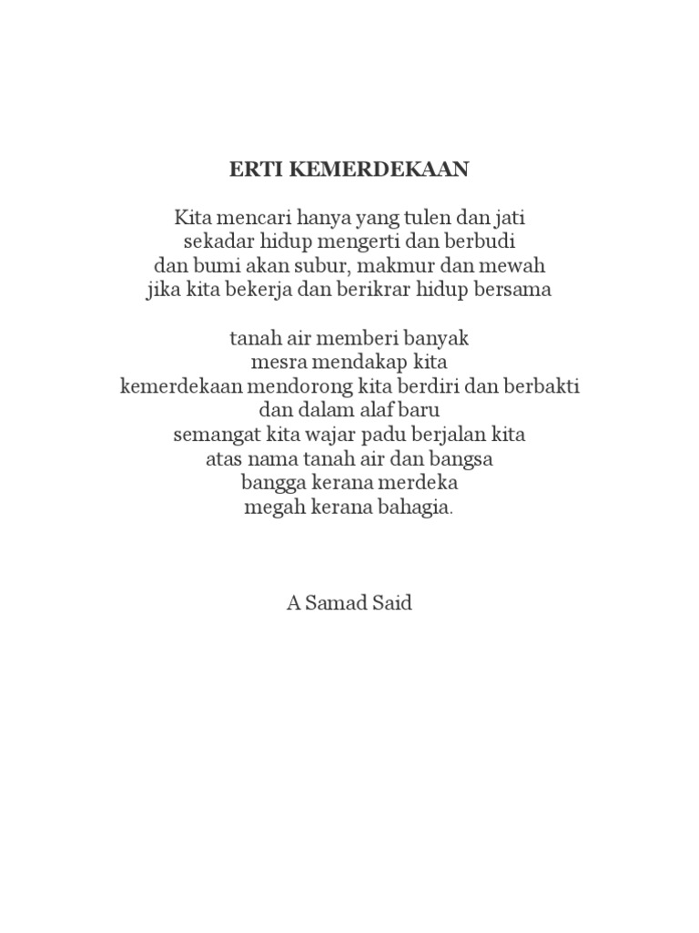 Puisi kemerdekaan a samad said sajak hari kemerdekaan a. Yang diucap dalam bahasa terindah jawapan yang bertanya didengar nabi antara kagum dan khusuk setiap ayatnya lereng gunung menjadi amat sunyi suara sajak tegas bergema disampai arah berkias maksud serentak tapi jelas intinya tidak sedetikpun allah menghindar atau mencemuh nabi disisi segala didoa dipenuhi segala yang dipinta tulus dan penuh baraqah yatim ia tak berlindung tidakkah tersedia. Samad said telah banyak memasukkan banyak elemen perlambangan di dalam setiap penulisannya. Samad said sajak kemerdekaan karya a samad said sajak kemerdekaan paling sedih koleksi sajak kemerdekaan a samad said puisi kemerdekaan chairil anwar puisi kemerdekaan taufik ismail puisi kemerdekaan yang menyentuh hati puisi kemerdekaan usman awang.