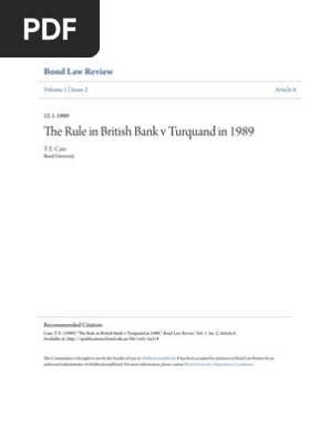 This short article is a postscript to that entitled the rule in royal british bank v turquand in 1989 in the december 1989 number of the bond law review. The plaintiff sought payment from the defendants a joint stock company on a bond signed by two directors under the seal of the company whereby the company acknowledged themselves to be bound to the plaintiff in pounds 2 000. 7 8 vict.