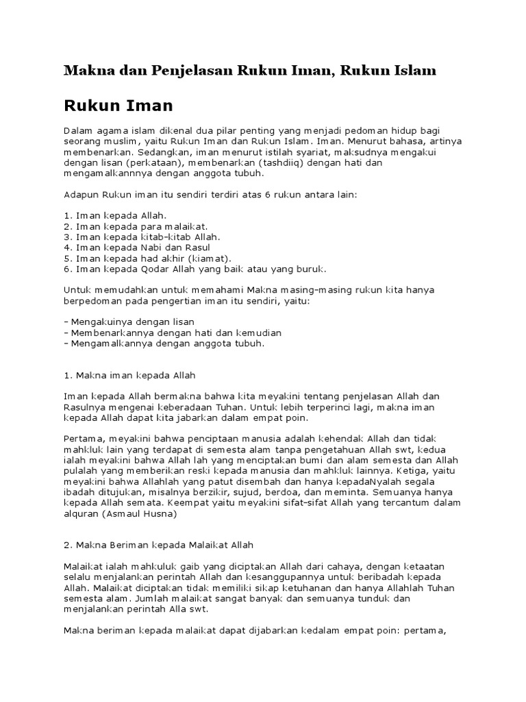 Dan apabila ia mengabaikan rukun iman dalam hidupnya maka ia akan dengan mudah diguncang hatinya dengan berbagai masalah dan kegelisahan dalam keimanan. Bertambahnya iman adalah dengan adanya amalan berkurangnya adalah dengan meninggalkan amalan seperti meninggalkan shalat zakat dan haji 6 rukun iman beserta penjelasannya 1. Iman kepada allah adalah rukun iman yang paling utama yang menjadi dasar keimanan pada seseorang. Rukun iman sebagai seseorang yang beragama islam wajib hukumnya untuk mengetahui lebih dalam mengenai rukun iman bukan hanya mengenalnya saja tetapi mendalaminya dan mengamalkannya juga merupakan suatu kewajiban yang harus di laksanakan oleh setiap muslim tanpa ada pengecualian.
