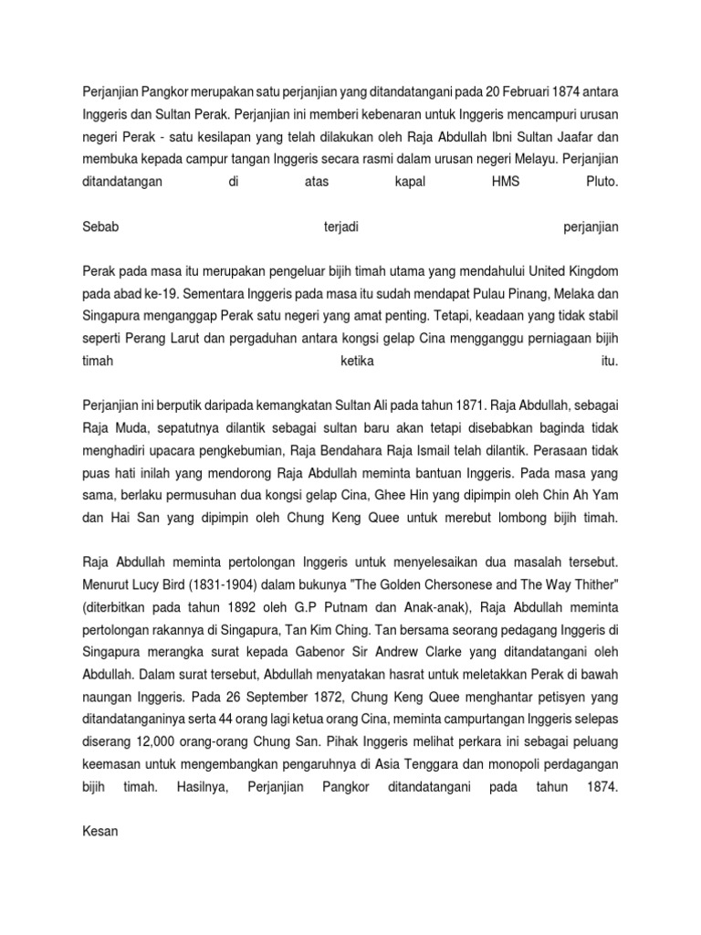 Turut sama di rundingan tersebut ialah andrew clarke raja muda abdul bendahara laksamana menteri larut syahbandar temenggung raja mahkota dan datuk sagor. Abstrak kajian ini dilakukan adalah bertujuan untuk mencungkil dan mengenalpasti kepentingan perjanjian britain belanda 1824 dan perjanjian pangkor 1874. The pangkor treaty of 1874 was a treaty signed between great britain and the sultan of perak on 20 january 1874 on hms pluto off the coast of perak. Manuskrip lama perjanjian pangkor perjanjian pangkor ditandatangani pada 20 januari 1874 diatas kapal berkuasa wap yang dahulunya dikenali hms pluto dan kini dikenali kolonial pluto colonial streamer pada hari tersebut juga pihak british mematerai 2 perjanjian lain.