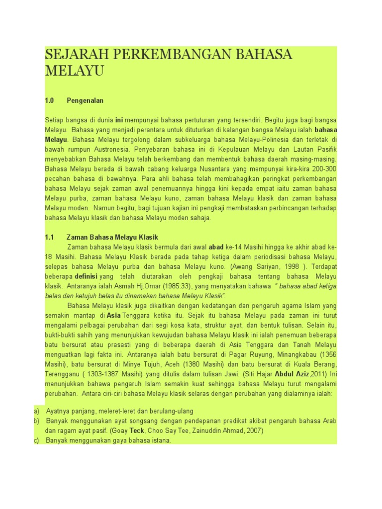 Amat juhari moain 2006 27 berpendapat bahawa terdapat 5 zaman perkembangan bahasa melayu ini membuktikan bahawa bahasa melayu tersebar dan berkembang secara bertahap tahap iaitu dari zaman ke zaman. Siri nota kuliah bmm 3112 laman laman perkongsian akademik dan pemikiran. Melancarkan usaha membina bahasa melayu. Sejarah dan perkembangan bahasa melayu 1 1 asal usul bahasa melayu 1 1 1 konsep melayu definisi melayu istilah awal etimologi dikaitkan dengan istilah kawasan kerajaan dan antara bukti sejarah.