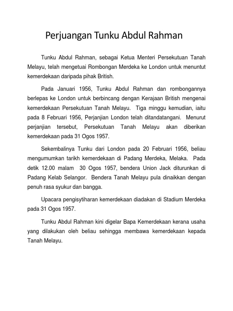 Pulang ke kedah dan memasuki penang free school. Selesai pengisytiharan dibaca tunku abdul rahman putra melaungkan merdeka sebanyak tujuh kali dan disambut oleh ribuan rakyat yang membanjiri stadium merdeka. Tunku abdul rahman 1957 1970 run abdul razak 1972 1976 dan tun hussein onn 1976 1981 tun mahathir mohamad 1981 2003 peranan dan sumbanqan malaysia datam pertubuhan m surat 9 10 11 14 14 16 faedah kebaikan i manfaat i sumbangan dasar luar malaysia. Upacara ini kemudiannya disusuli dengan seruan azan yang melambangkan islam sebagai agama rasmi negara yang baru merdeka diikuti dengan acara menaikkan bendera persekutuan tanah melayu sambil diiringi dengan lagu kebangsaan.