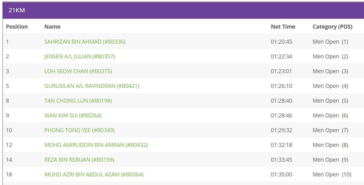 Here you can discover new races and products buy tickets for running events directly through our platform and create a free account to keep track of your timing results and performance data as well as start your own blog. 8 jul 2018 distance. Seremban half marathon 2018 seremban half marathon 2018 21km results c0606 moey wooi san. View all past race results.