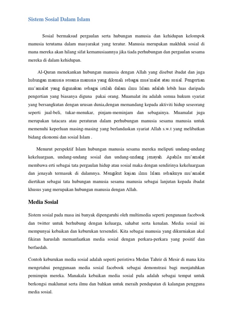Pengertian politik menurut islam politik adalah ilmu pemerintahan atau ilmu siyasah iaitu ilmu tata negara. Istilah ini juga apabila dihubungkaitkan dengan manusia membawa pengertian kepada sebarang kelakuan atau sikap yang dipengaruhi oleh pengalaman pengalaman dan tingkah laku orang lain yang telah lalu dan semasa sama ada secara langsung atau secara tidak langsung. Prinsip ekonomi dalam islam keadilan sosial. 1 1 pengertian sistem sosial menurut islam perkataan sosial bererti setiap aktiviti atau kegiatan manusia dalam masyarakat.