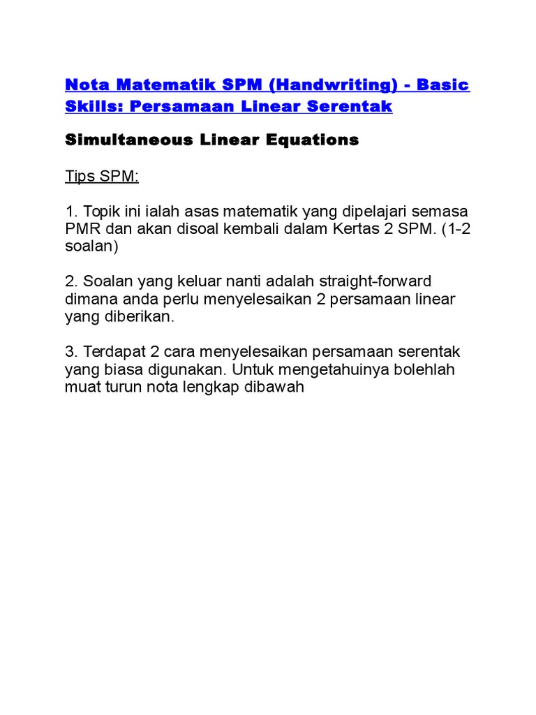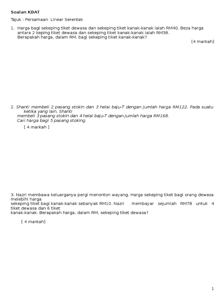 Persamaan linear terdapat juga dalam 3 pembolehubah dan 4 pembolehubah. Related posts to contoh soalan kbat persamaan linear serentak contoh soalan kbat persamaan linear serentak 2019 09 30t08 01 00 07 00 rating. Persamaan linear serentak soalan 1 kbar hitungkan nilai k dan w yang memuaskan persamaan linear serentak berikut. Kali ini kita lihat formula persamaan linear serentak.