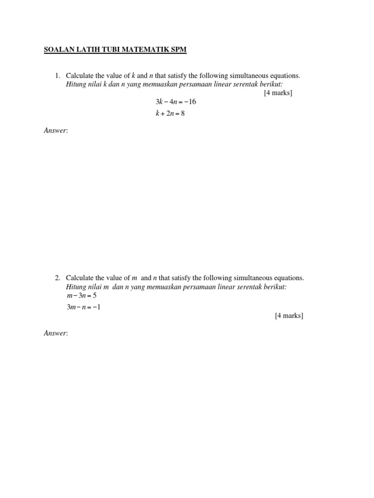 Latihan 4 1 selesaikan persamaan linear serentak berikut. Cuba lihat formula ini. Dua persamaan linear serentak boleh ditulis dalam bentuk persamaan matriks. Latihan matematik tambahan 2015.
