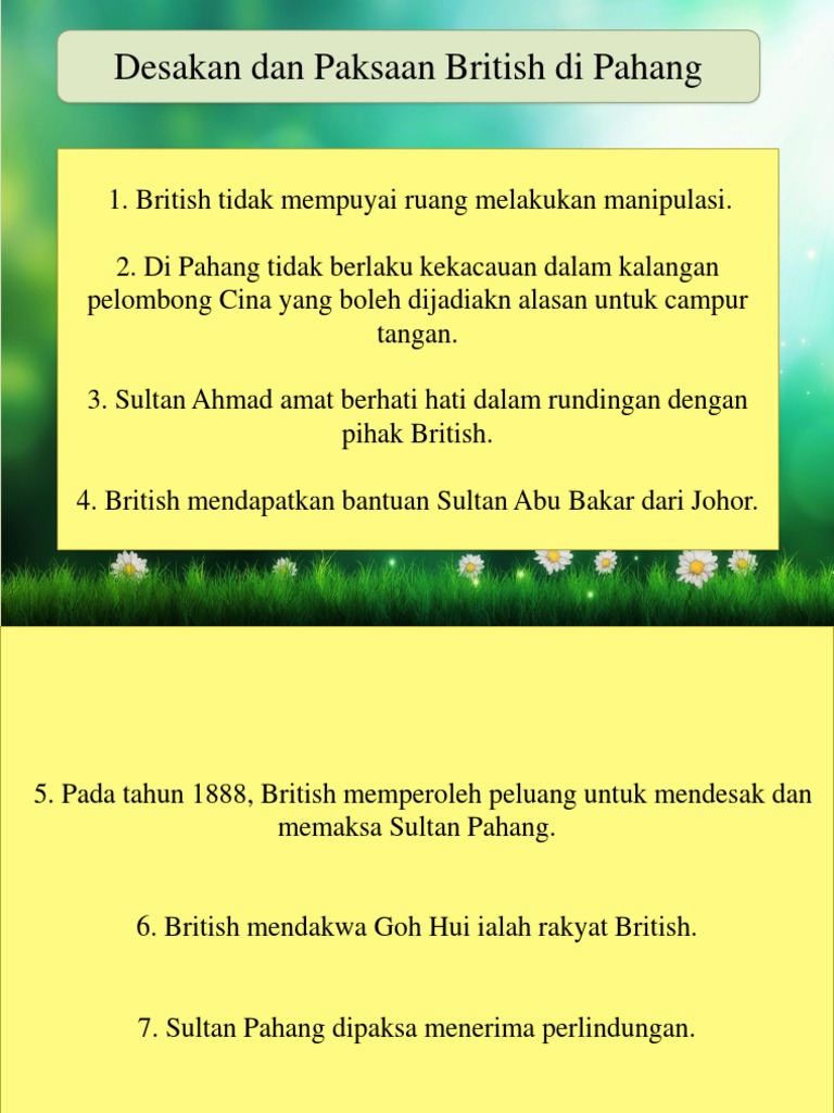 Strategi desakan british di selangor dan pahang. Keadaan di perak selangor negeri sembilan dan pahang memberi peluang campur tangan british. Pahang merupakan sebahagian dari melaka semasa keagungan kesultanan melayu melaka. Campur tangan british di pahang 1888. Keadaan ini diburukkan lagi dengan pertempuran antara kongsi gelap cina ini menyebabkan british berjaya meletakkan residennya di selangor pada tahun 1874.