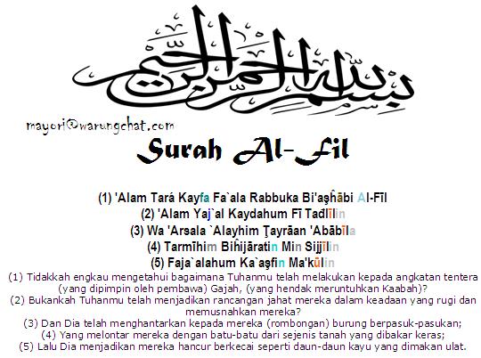 Mengenai makna dan isi kandungan qs al fiil ini secara garis besar adalah menerangkan tentang gagalnya usaha penghancuran kabah oleh pasukan gajah yang dibinasakan oleh allah swt. Rumi surah al fil surah al fil panduan. Surah al fiil rumi surah al fiil gajah bimillaahir rahmaanir rahiim 1 alam tara kayfa fa ala rabbuka bi ash haabil fiil 2 alam yaj al kaydahum fi tadhliil 3 wa arsala alayhim thay ran abaabiil 4 tarmiihim bi hijaaratin min sijjiil 5 faja alahum ka ashfinma akuul. Kita akan kongsi bacaan surah al kahfi dalam rumi full beserta tulisan jawi.