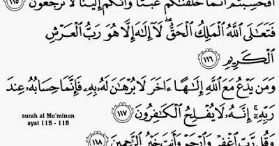 Surat al mu minun ayat 115. Dinamai al mu minuum karena permulaan surat ini menerangkan bagaimana seharusnya sifat sifat orang mu min yang menyebabkan keberuntungan mereka di akhirat dan ketentraman jiwa mereka di dunia. Baca juga surat al mu minun teks arab terjemah bahasa indonesia dan bahasa inggris. Adalah sebuah search engine khusus tafsir al quran dan hadits untuk memudahkan umat islam mencari dan memahami tafsir ayat ayat.