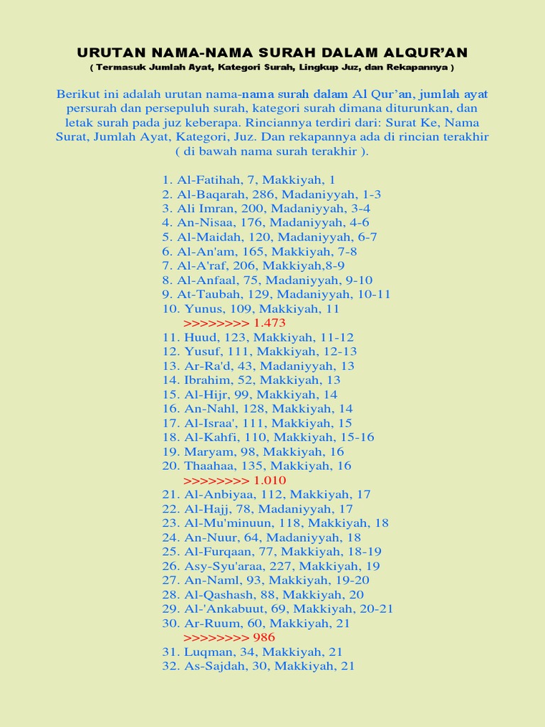 Meskipun demikian secara umum al qur an dan semua surah di dalamnya disebut al maṡānī karena di dalamnya diceritakan berbagai kisah dan kabar berita secara berulang ulang. Artikel yang menyajikan daftar surat dalam al quran dan jumlah ayatnya yang berisi 114 surat dan 6236 ayat disajikan dalam bentuk tabel sehingga akan memudahkan anda dalam mengetahui nama nama surat dalam quran dan jumlah ayatnya secara lengkap dan terperinci. Diantara 10 nama malaikat ada salah satu nama malaikat yang menyampaikan wahyu dia adalah malaikat jibril. Wikipedia salah satu surat yang paling banyak dibaca di indonesia adalah surat yasin.