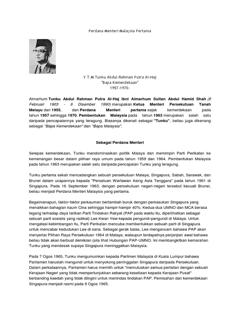 Tunku abdul rahman putra al haj ibni almarhum sultan abdul hamid halim shah lahir. Terangkan sumbangan tunku abdul rahman putra al haj dalam bidang politik sejak dilantik menjadi presiden umno pada tahun 1951. Beliau belajar di sekolah melayu sebelum berpindah ke penang free school. Perdana menteri yang pertama tunku abdul rahman putra al haj yang digelar sebagai bapa kemerdekaan adalah orang yang bertanggungjawab berusaha memerdekakan tanah melayu dari cengkaman pihak penjajah terutama pihak british.