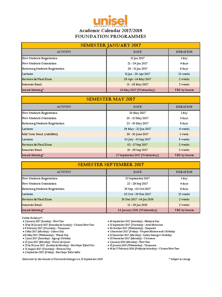 Unisel academic calendar 2018. The yong loo lin school of medicine and the faculty of dentistry operate on a slightly different academic calendar structure. Students union day academic council meeting 11 sep 2018 no classes for ug programmes from 1030 to 1430 hours. Teaching week on the calendar. Bestari jaya campus du 007 01 b jalan timur tambahan 45600 bestari jaya selangor darul ehsan malaysia 603 3280 5062.