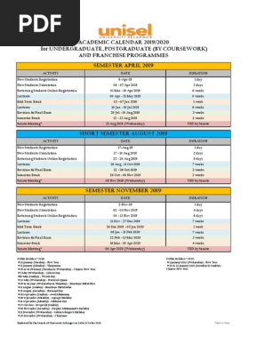 Academic calendar 2019 2020 for undergraduate postgraduate by course work franchise programmes. 1 commences on first monday of august each year. Leader of transformation programmes offered enroll into any of unisel s over 70 programs in various foundation undergraduate and post graduate studies and receive a world class education. Of weeks lecture period continuous teaching learning and assessment.