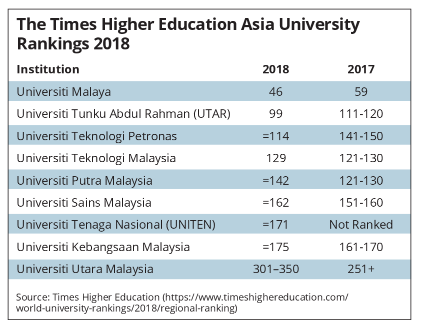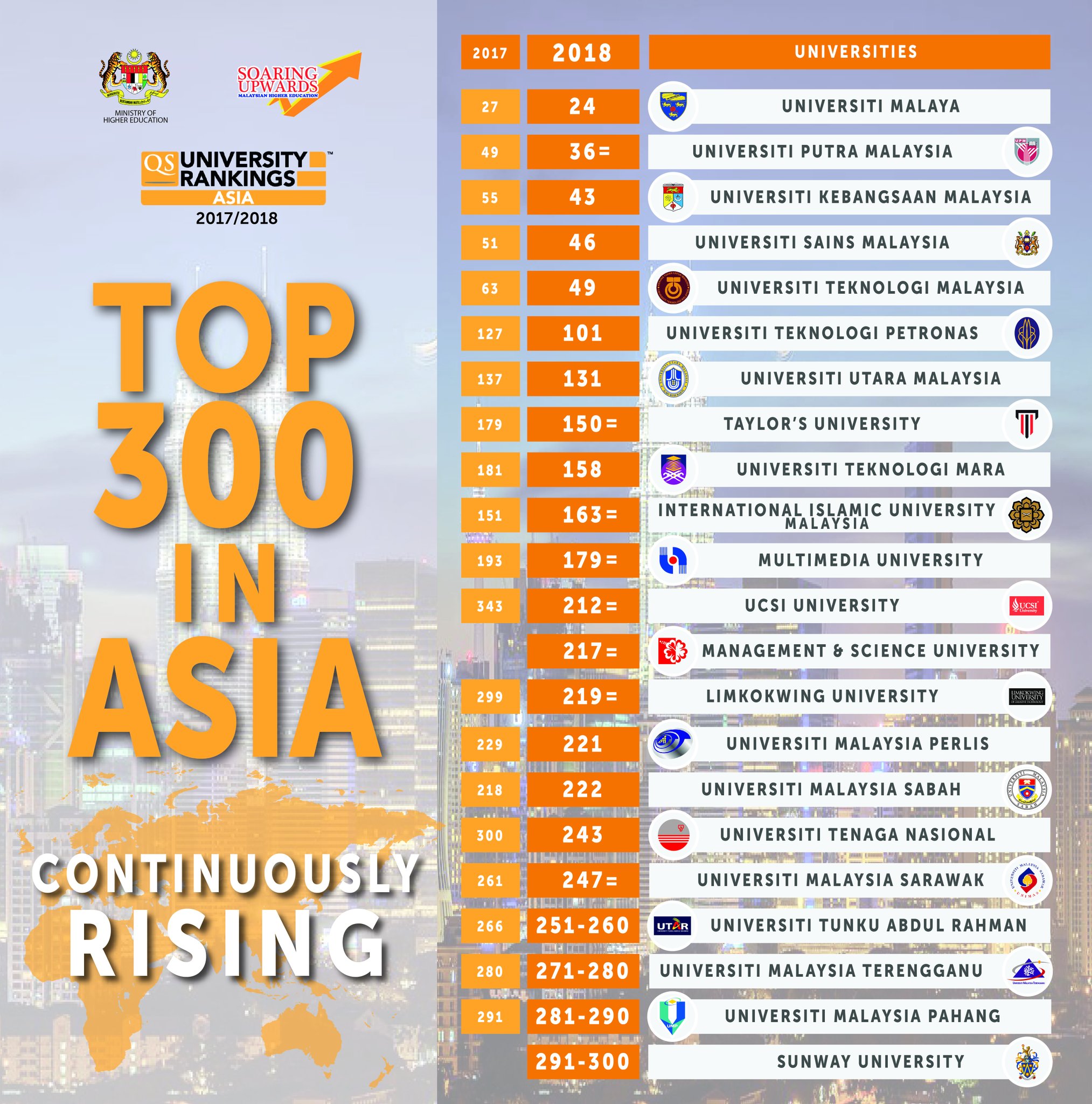 Presence rank impact rank openness rank excellence rank 1. In the latest qs asia university rankings 2018 that features over 400 universities and 17 different countries malaysian universities record their best ever performance with five malaysian universities in the top 50 ranking. 50 of these universities are listed in at least one institution or subject specific ranking. Universiti teknologi petronas petronas 701 750.