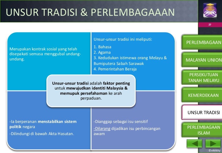 Ia dianggap sebagai satu kontrak sosial yang meliputi 4 aspek termasuklah institusi beraja agama islam bahasa melayu dan kedudukan istimewa orang melayu. Unsur unsur tradisi sebenarnya telah wujud sejak ratusan tahun yang lalu sebelum pembentukan perlembagaan pada tahun 1957. 3 0 unsur unsur tradisi dalam perlembagaan malaysia kebanyakan perlembagaan persekutuan mengandungi amalan yang diwarisi daripada zaman penjajahan kecuali peruntukan tentang pentadbiran parlimen dan kewarganegaran terdapat fasal fasal yang diwarisi sejak zaman penjajahan dan masih dikekalkan dalam perlembagaan persekutuan. Pengetahuan tentang perkara ini amat penting untuk semua kaum agar kaum lain mengetahui dan.
