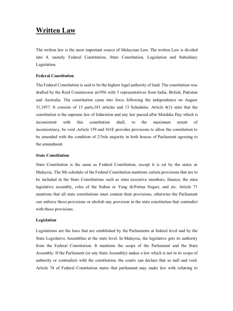Written law is the most important source of law. All of the thirteen states have their own constitutions known as the state constitution. 1 5 currency the currency in malaysia is decimal with the ringgit malaysia rm as the basic unit and 100 cents sen to a ringgit. Explain the written and unwritten law.
