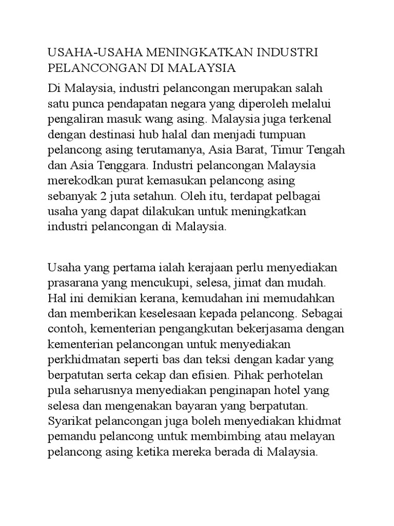 Usaha usaha memajukan industri pelancongan negara sebagai sebuah negara yang beriklim khatulistiwa malaysia mempunyai alam semula jadi yang unik dengan deretan pulau yang menawan. Malaysia juga terkenal dengan destinasi hub halal dan menjadi tumpuan pelancong asing terutamanya asia barat timur tengah dan asia tenggara. Contoh karangan pelancongan pt3. Ipendidikan karangan usaha dan langkah memajukan sektor pelancongan di malaysia disemak dan dikemaskini pada pukul 3 50 pm 3 julai 2020 terdapat pelbagai kaedah dalam memastikan pelajar menguasai penulisan karangan bahasa melayu antaranya adalah dengan melakukan latihan tambahan.
