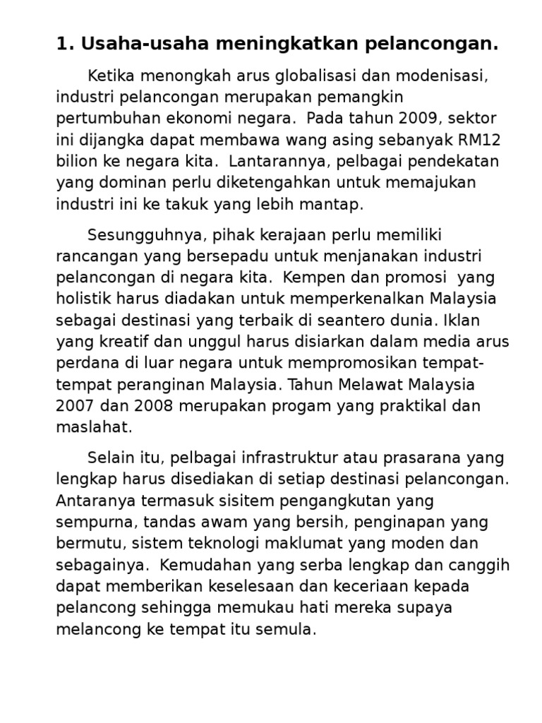Usaha usaha memajukan industri pelancongan pt3. Sektor pelancongan di negara kita berkembang maju dan menjadi sumber pendapatan negara yang penting tempat pelancongan di negara ini dibuka dengan banyak seperti cendawan selepas hujan kerajaan telah menggerakkan semua agensinya untuk memastikan sektor pelancongan berkembang pesat sejajar dengan. Malaysia juga terkenal dengan destinasi hub halal dan menjadi tumpuan pelancong asing terutamanya asia barat timur tengah dan asia tenggara. Contoh karangan pelancongan pt3. Untuk makluman semua penulisan karangan bahasa melayu mempunyai pelbagai tajuk dan tema yang berpotensi menjadi soalan pilihan karangan dalam peperiksaan.