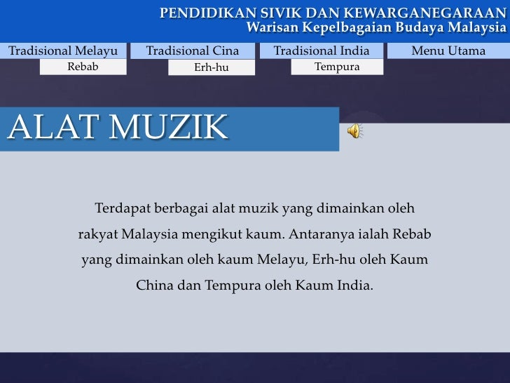 Pendidikan sivik dan kewarganegaraan warisan kepelbagaian budaya malaysiatradisional melayu tradisional cina tradisional india menu utama rebab erh hu tempuraerh hu pengenalan erh hu fungsi alat ini digunakan dalam orkestra untuk mengiringi opera cina atau secara solo. Menyatakan amalan ajaran agama masing masing dan pelbagai agama lain di malaysia. Cara mempromosikan warisan budaya malaysia di dalam dan di luar negara duta kecil. Menerangkan nilai nilai murni yang terdapat dalam pelbagai agama.
