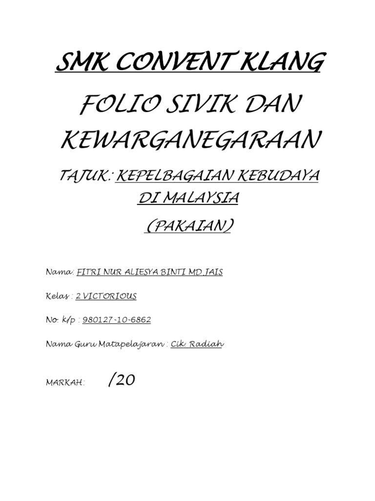 Melibatkan mengekalkan kaum. Contohnya melayu cina india dan lain lain. Pendidikan sivik dan kewarganegaraan warisan kepelbagaian budaya malaysia hasil hasilaneka kraf hasil tanah tekstil menu utama rimba logamhasil tanahseni kraf berasaskan tembikar kristal kaca dan batumarmar salah satu contoh ialah labu sayong yang diperbuatdari tanah liat yang diuli diterap dengan pelbagaicorak diasapkan serta dibakar untuk menghasilkansatu rupa bentuk yang sungguh berseni. Saya telah menyiapkan folio yang bertajuk kepelbagaian kebudayaan di malaysian pakaian bersama dengan keluarga dan rakan rakan saya.