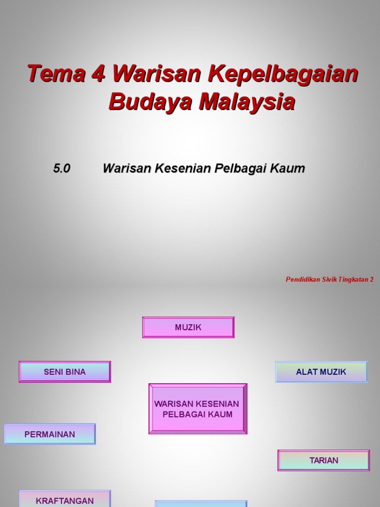Warisan kepelbagaian budaya malaysia tingkatan 5. Pelajar dan pekerja malaysia di luar negara. Tingkatan 1 tema 4. Kami seramai 5 orang dalam 1 kumpulan berkerjasama untuk mengumpul dan menyebarkan maklumat di laman wed kami bagi memenuhi sukatan pembelajaran kami dan sekaligus belajar mengetahui dan mengenali warisan kepelbagaian kaum di negara kita. Cara mempromosikan warisan budaya malaysia di dalam dan di luar negara duta kecil.